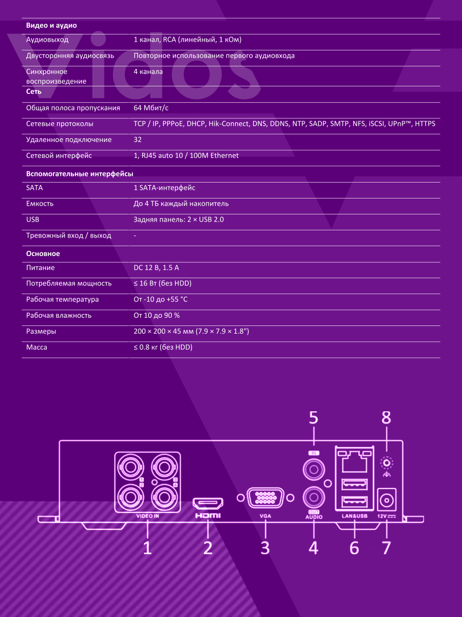 обнаружение движения 2.0 («Человек», «ТС») на основе алгоритма глубокого обучения • Видеосжатие H.265 Pro+ / H.265 Pro / H.265 / H.264+ / H.264 • Видеовходы HDTVI / AHD / CVI / CVBS / IP • Аудио по коаксиальному кабелю • IP-видеовходы: до 5 каналов (до 2 Мп) • Возможность кодирования до 1080p Lite @ 15 к/с • Макс. 1200 м для сигнала HDTVI 720p