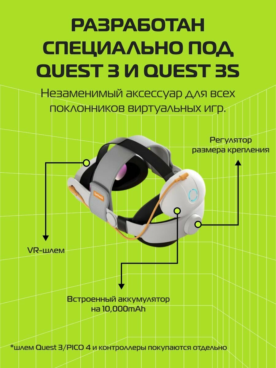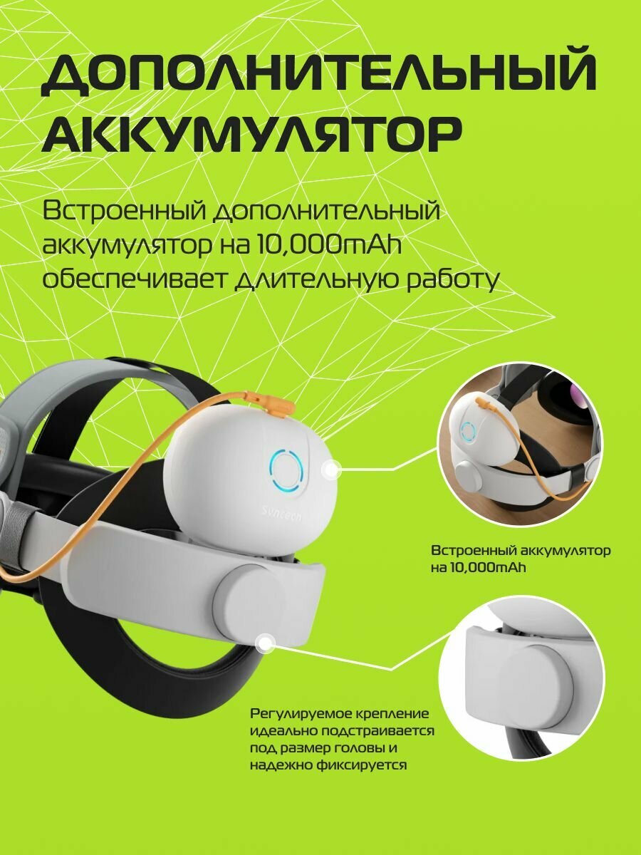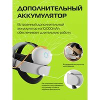Регулируемое крепление для Oculus Quest 3 / 3S – это идеальный аксессуар для ваших виртуальных приключений. С этим креплением вы сможете наслаждаться продолжительными игровыми сессиями и погружением в виртуальную реальность, не беспокоясь о разрядке устройства. Встроенный дополнительный аккумулятор на 10,000mAh обеспечивает длительную работу, позволяя вам играть и исследовать без перерывов на подзарядку.