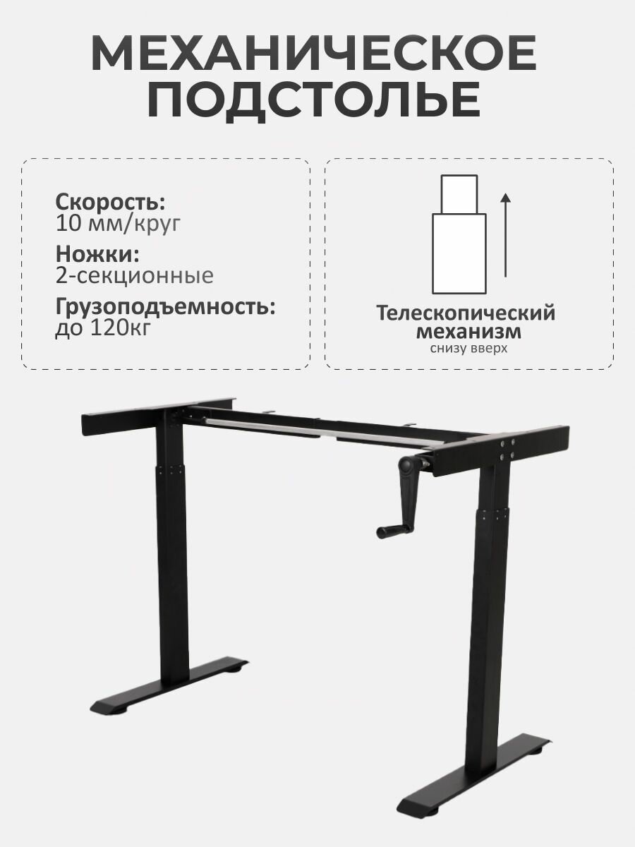 Стол компьютерный с механическим (ручным) поднятием подходит для дома, офиса или дачи. Стол компьютерный позволяет чередовать работу стоя и сидя, как Вам удобно. Идеальное сочетание: серое подстолье и черная столешница. Стол с регулировкой высоты создает комфортную рабочую среду, которая способствует поддержанию здоровья и продуктивности пользователей. Опора для стола безопасна для ежедневного использования, благодаря отсутствию открытого подвижного вала в конструкции. Размер столешницы: 140х60 см. Материал столешницы: ЛДСП.