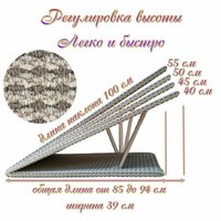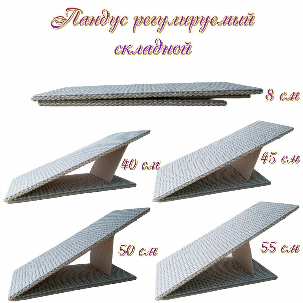 Габариты пандуса по основанию зависят от выставленной высоты. При выставленной высоте 55 см, длина по основанию 85 см, при выставленной высоте 40 см, общая длина будет 94 см.