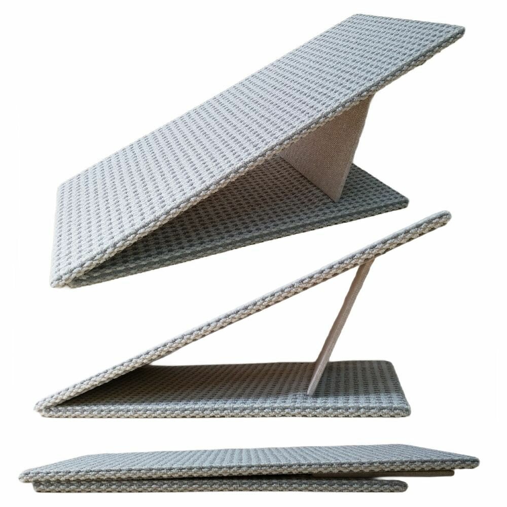 Пандус прикроватный изготовлен из прочной фанеры и выдерживает вес в 70 кг. Наклонная часть пандуса и основание оббито прочным петлевым ковролином, а ножка оббита прочной рогожкой.