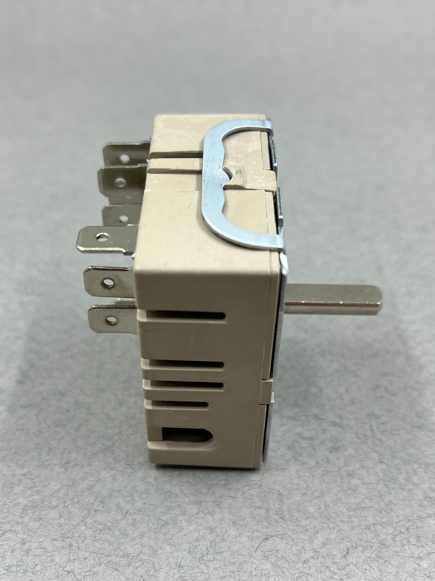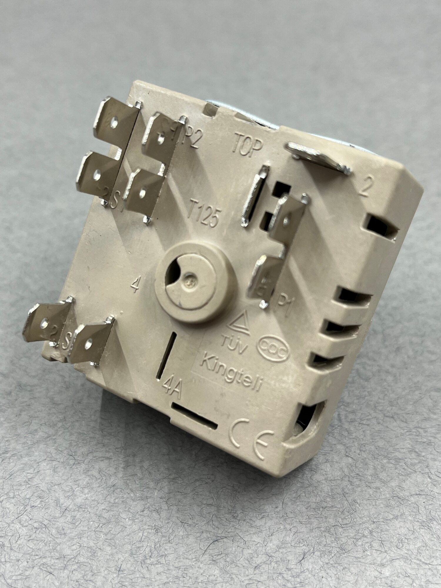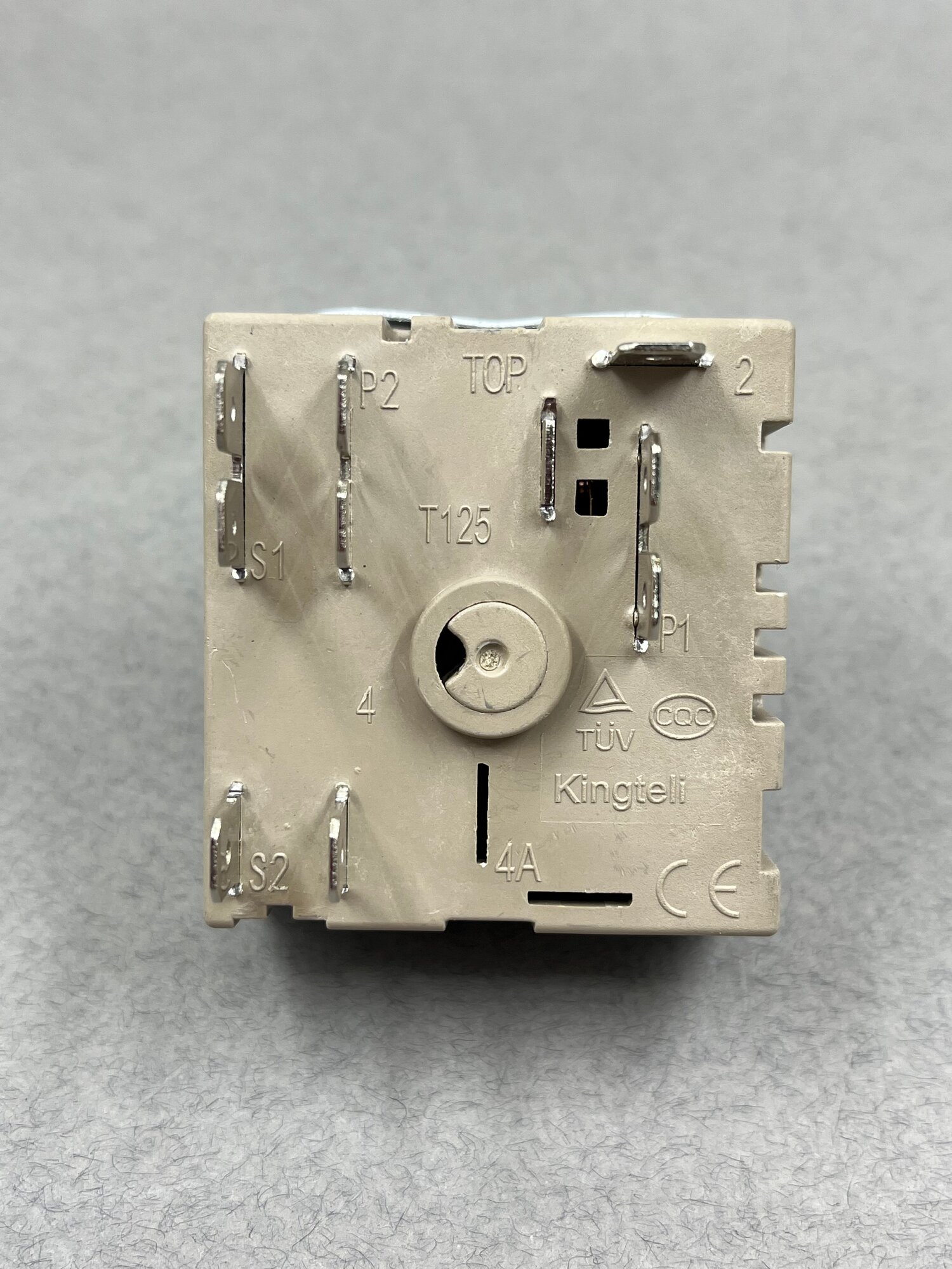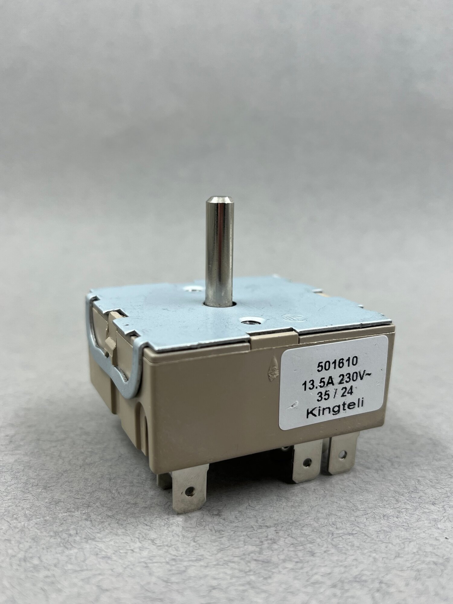 Регулятор мощности для плит и варочных электрических поверхностей Haier (Хайер), Candy (Канди), Hyundai (Хёндэ) и некоторых других. Переключатель Kingteli номер 501610. Ранее мог поставляться 501614, 45ER131C1 или 45ER142C1. Регулятор конфорки с одной зоной нагрева. Размер корпуса переключателя: 45 x 50 x 21 мм. Металлический шток для длиной 22 мм. Толщина 6 мм. Расстояние между центрами крепежных отверстий 28 мм. Регулятор переключения мощности однозонный для стеклокерамической варочной поверхности имеет 9 контактов. клеммы шириной 6 мм. Каждый контакт имеет маркировку для правильного подключения. Парт номера запасной части: 0530013932, 0530023789, 49089736.