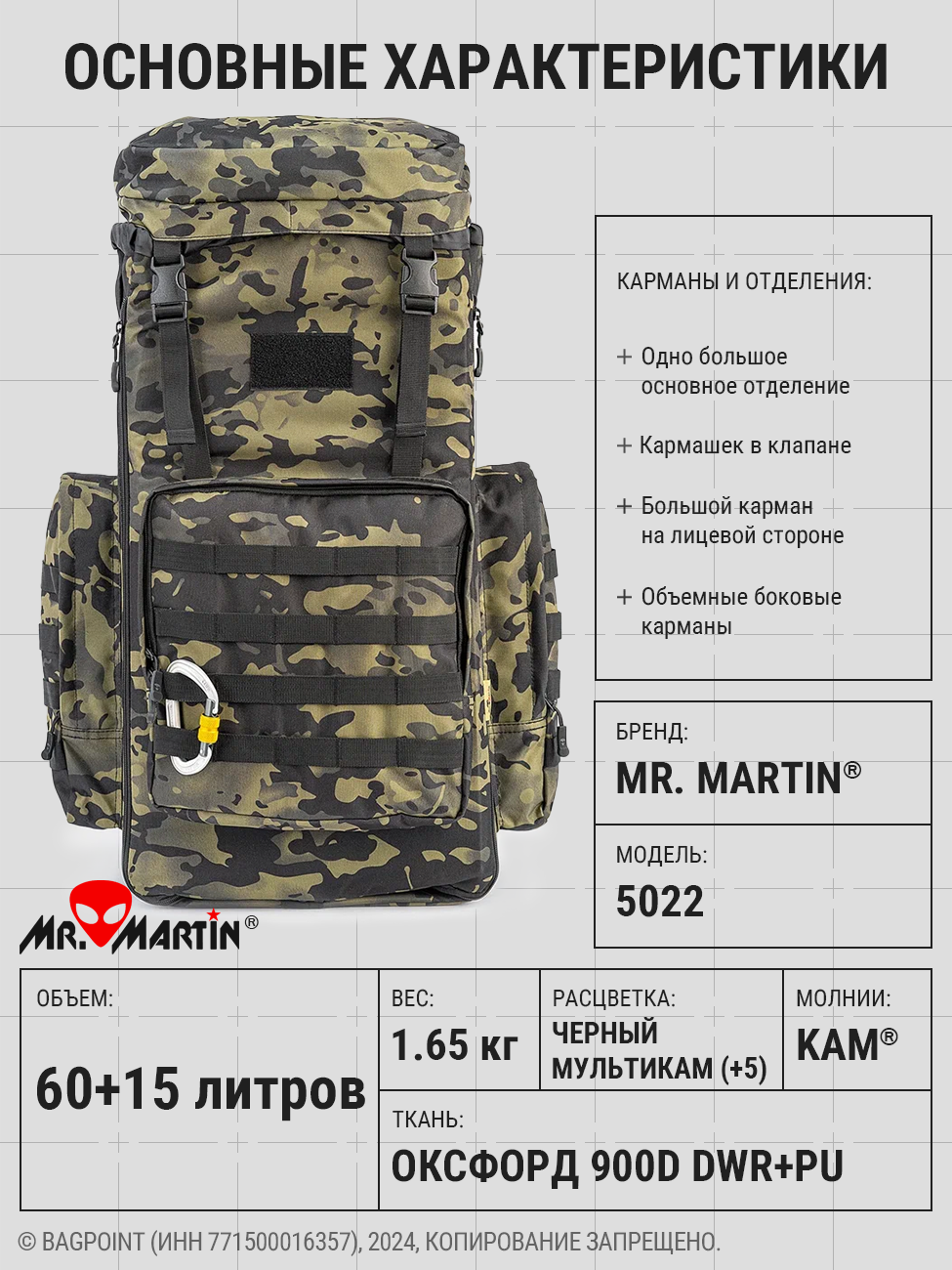 Надежная фурнитура Mr. Martin: прочные молнии с двойными металлическими бегунками на длинных завязках, пластиковые компоненты (фастексы, полукольца) из композитных материалов;