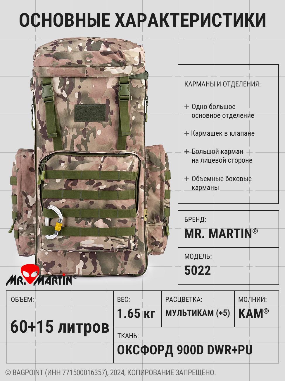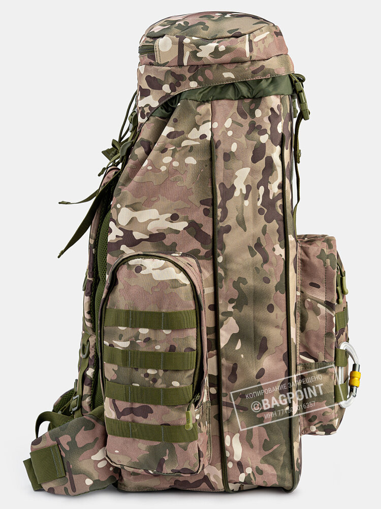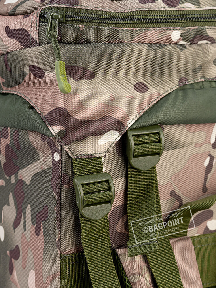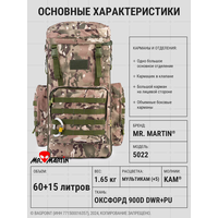 Рейдовый рюкзак для дальних походов объемом около 70 (+15) литров Mr. Martin 5022 в камуфляжной расцветке "Мультикам" (англ. MultiCam). При необходимости объем рюкзака легко можно увеличить на 13-15 литров: на фронтовой стороне вдоль боков и дна имеется молния, при расстегивании которой рюкзак расширяется примерно на 10 см, увеличивая объем рюкзака примерно до 85 литров. Идеален для походов средней и дальней продолжительности, охоты, рыбалки.