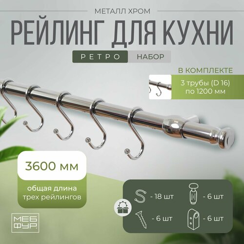 Купить Рейлинг 360 см «MOVEIS» для кухни с крючками хром «ретро», в наборе 3 штанги по 120 см (3600 мм)+крючки+держатели+заглушки с доставкой по всей России. Рейлинг 360 см «MOVEIS» для кухни с крючками хром «ретро», в наборе 3 штанги по 120 см (3600 мм)+крючки+держатели+заглушки: сравнение цен, характеристики, фото, актуальное наличие и цены.