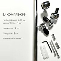 | Подробная комплектация | труба рейлинга 60 см - 1 шт, держатели рейлинга - 2 шт, заглушки рейлинга - 2 шт, крепеж держателей - 2 шт |