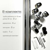 | Подробная комплектация | труба рейлинга 60 см - 1 шт, держатели рейлинга - 2 шт, заглушки рейлинга - 2 шт, крепеж держателей - 2 шт |