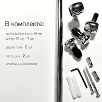 | Подробная комплектация | труба рейлинга 60 см - 1 шт, держатели рейлинга - 2 шт, заглушки рейлинга - 2 шт, крепеж держателей - 2 шт |