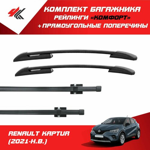 Комплект: рейлинги "Комфорт" на крышу RENAULT KAPTUR (2021-Н.В.) черные + поперечины "PT-Group" прямоугольные 130 см