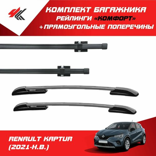 Комплект: рейлинги "Комфорт" на крышу RENAULT KAPTUR (2021-Н.В.) серебристые + поперечины "PT-Group" прямоугольные 130 см