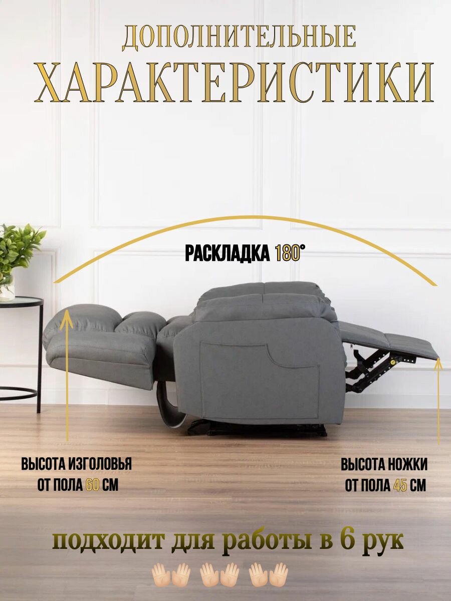 Двухмоторный реклайнер — это идеальный выбор для тех, кто ценит функциональность и комфорт. Небольшие детали, такие как удобные подлокотники и поддержка поясницы, делают это кресло настоящей находкой для салона красоты или вашего дома. Оно легко станет вашим любимым местом для чтения, просмотра телевизора или просто спокойного отдыха.