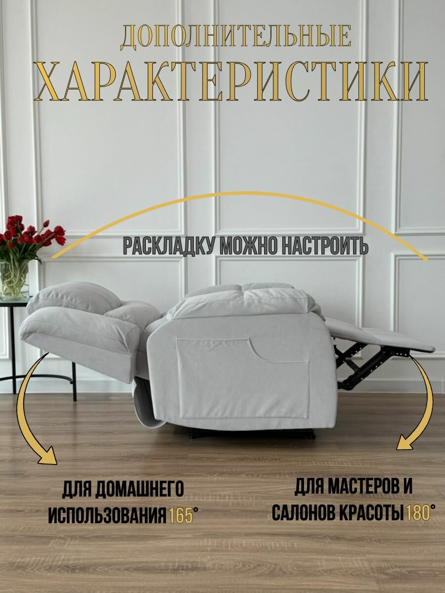 Двухмоторный реклайнер — это идеальный выбор для тех, кто ценит функциональность и комфорт. Небольшие детали, такие как удобные подлокотники и поддержка поясницы, делают это кресло настоящей находкой для салона красоты или вашего дома. Оно легко станет вашим любимым местом для чтения, просмотра телевизора или просто спокойного отдыха.