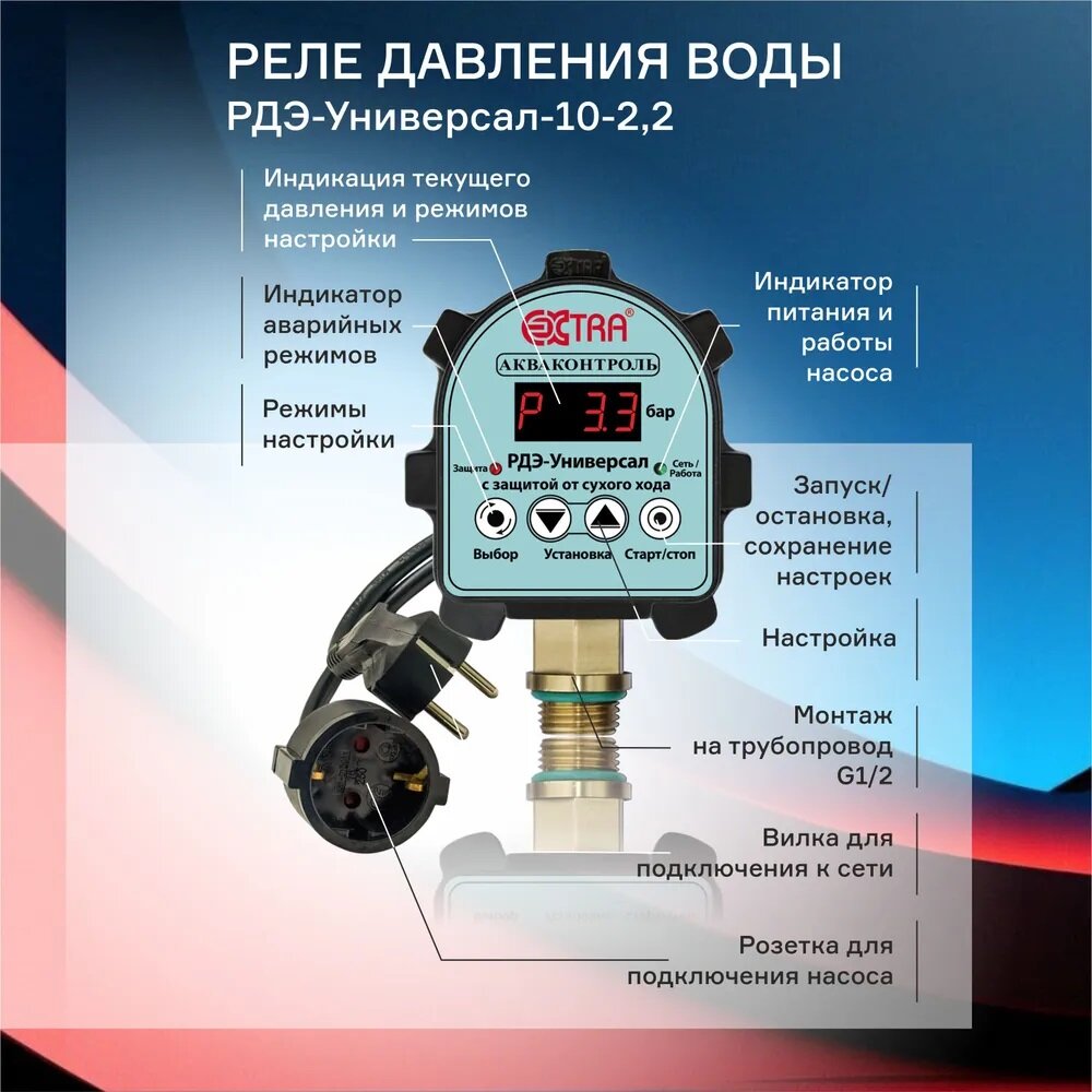 Модели реле давления Extra Акваконтроль РДЭ-Универсал предназначены для автоматизации работы бытового электронасоса, используемого в системах автономного водоснабжения. Реле обеспечивает однополюсное отключение насоса, защиту его от работы без воды (”сухого хода”), позволяет индивидуально настроить время задержки автоматического перезапуска насоса после срабатывания защиты от сухого хода и установить до 99 перезапусков до перехода в режим аварии.