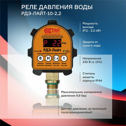 Реле давления воды электронное Extra Акваконтроль РДЭ-Лайт-10-2,2 для систем водоснабжения. Акваконтроль РДЭ-Лайт-10-2,2 на базе пьезорезистивного тензорного датчика давления - современный электронно-цифровой прибор для управления насосом в системе водоснабжения. РДЭ является более продвинутым и надёжным решением для управления насосом и предлагает существенно увеличенный набор функций. Отличия от стандартной модели РДЭ простое управление каждая кнопка отвечает за программирование одной функции. В реле установлены оптимальные настройки, которые подойдут для большинства режимов работы. Они установлены в качестве заводских, и позволяют возвращаться к ним в любой момент. Реле этой модели относится к разряду универсальных. Оно отлично подойдет для решения стандартных задач по осуществлению подачи воды с использованием насосов разного типа и вида. Его основными достоинствами являются простота и бесперебойная работа в автоматическом режиме. В устройствах этой серии реализована защита от сухого хода. Реле имеет следующие функции: регулировки давления для включения и выключения насоса; регулировку давления сухого хода; регулировка времени задержки защиты насоса от сухого хода; Реле имеет интуитивно понятное меню. Программа сохраняет свои настройки при отключении сети и перепадах напряжения. Изделие может подключаться непосредственно к насосу. Это избавит вас от использования дополнительных проводов. Выбрав данную модель, вы успешно решите задачу по созданию системы водоснабжения. РДЭ-Лайт-10-2,2 предназначен для эксплуатации в зонах умеренного/холодного климата, в закрытых помещениях без искусственного регулирования климатических условий и отсутствия воздействия рассеянного солнечного излучения и конденсации влаги. Технические характеристики: