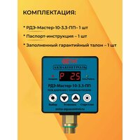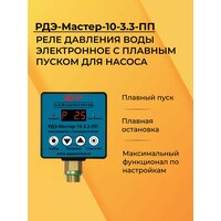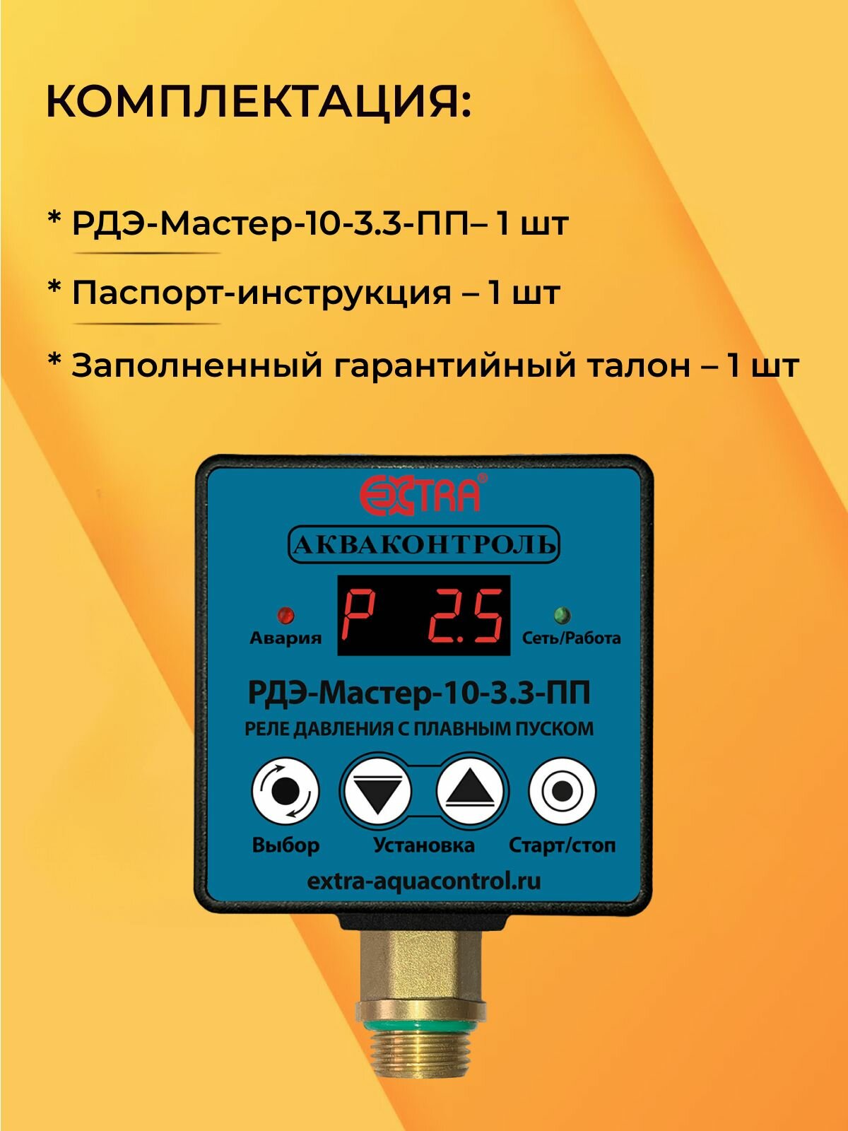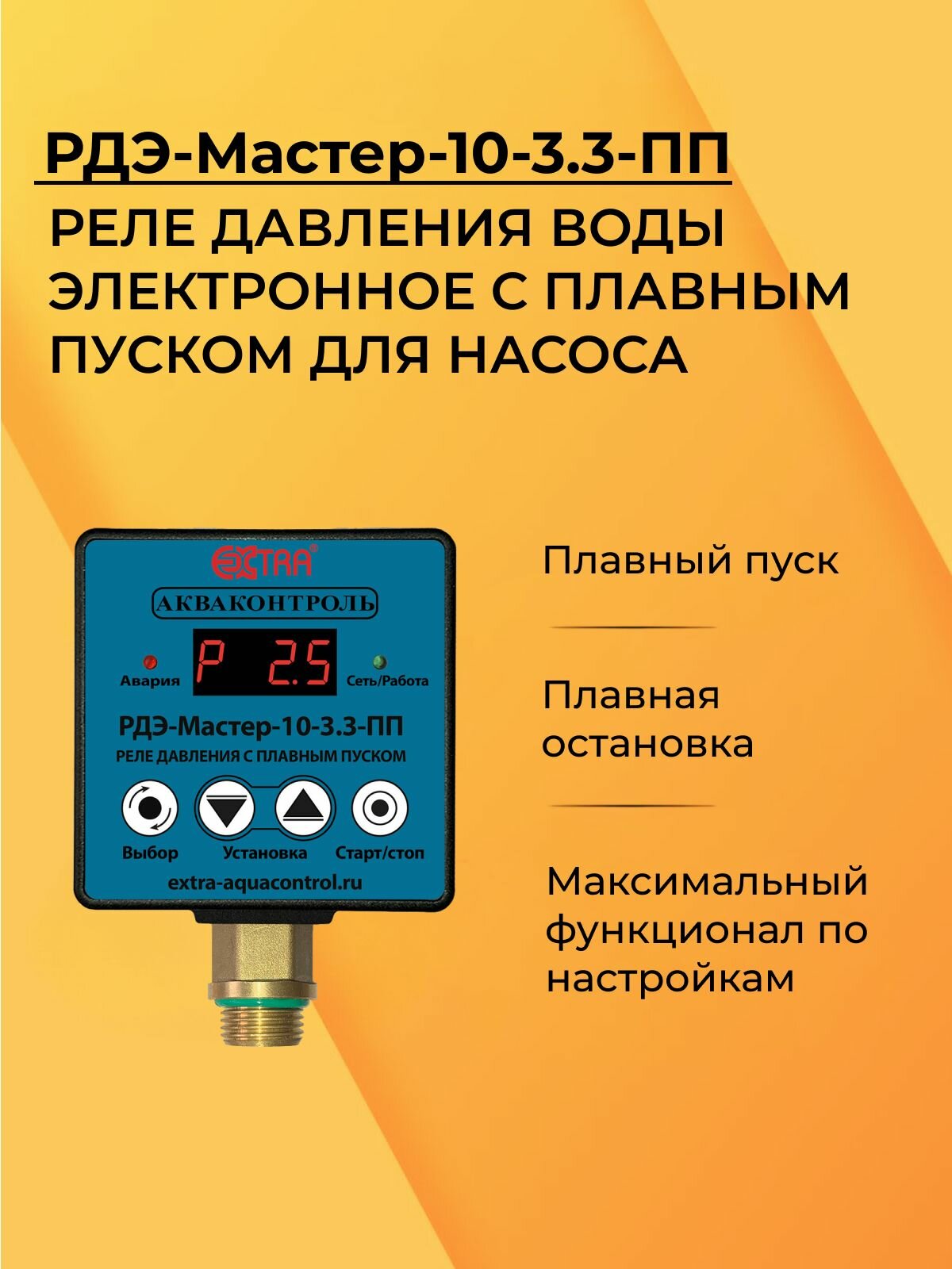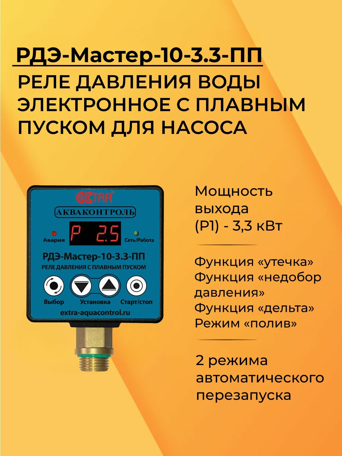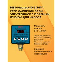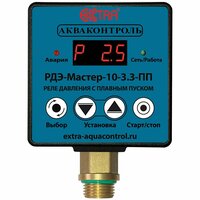 Модель реле давления РДЭ-Мастер-10-3,3 EXTRA Акваконтроль предназначена для автоматизации работы бытового электронасоса используемого в системах автономного водоснабжения и полива, а также имеет специальные функции управления и защиты для оптимизации эксплуатации скважинных насосов работающих в малодебитных скважинах. Модель РДЭ-Мастер-10-3,3 предназначена для автоматизации работы бытовых насосов мощностью РТ не более 3,3 кВт. Реле предназначено для работы в системе с гидроаккумулятором. Возможности устройства:
