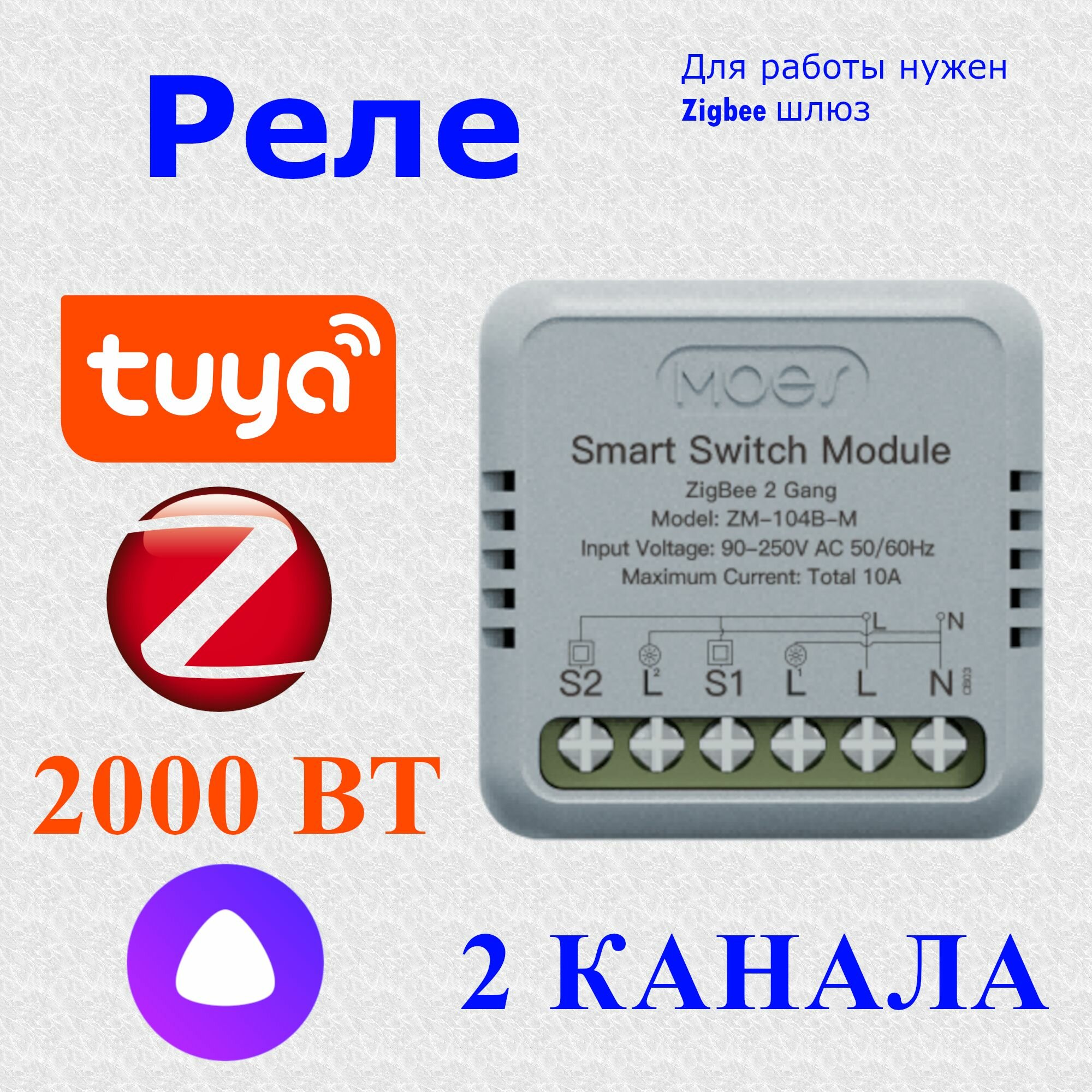 Для подключения необходимо наличие нулевого проводника. Для удаленного управления нужен Zigbee шлюз. MOES ZM-104B, протокол связи Zigbee 3.0. Реле на 2 канала, на каждый канал не более 10А, 220В. Устанавливается как на дин рейку так и в обычный подрозетник. Умный дом Яндекса видит как 3 разных выключателя: - ВКЛ/откл клавиша 1 - ВКЛ/откл клавиша 2 - ВКЛ/откл одновременно 2 клавиши. Настройки в приложении: - работа с обычным выключателем или звонкового (кнопочного) типа; - задержка на включение, на выключение, циклическая работа, включение в случайном порядке; - настраиваемое состояние после аварийного выключения электроэнергии (вкл, выкл. или последнее состояние перед отключением).