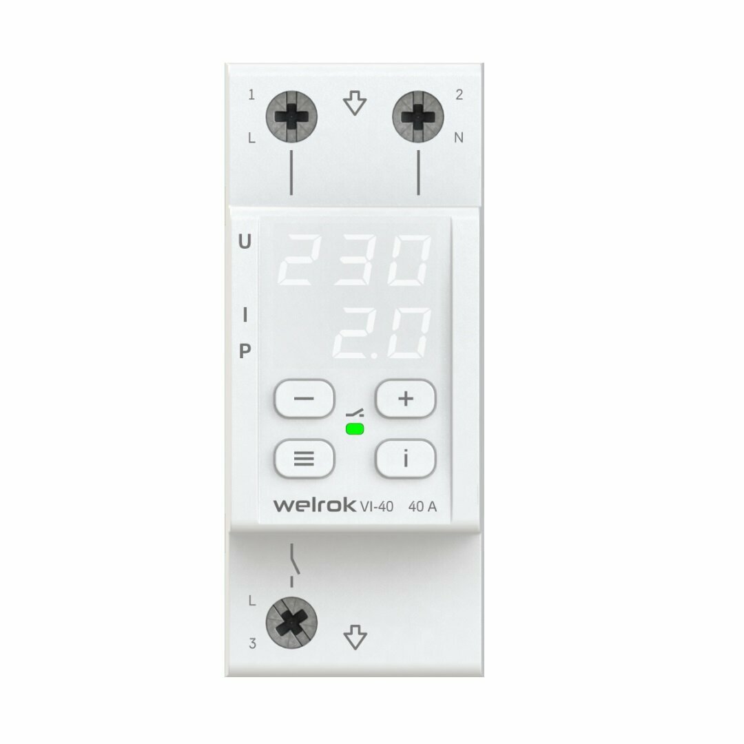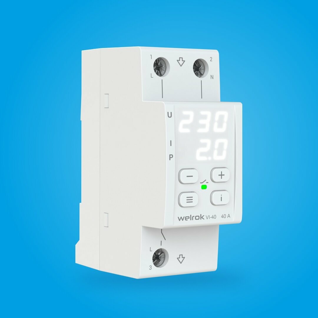 Реле напряжения с контролем тока Welrok VI-40 защищает оборудование от скачков и провалов напряжения, последствий обрыва нулевого провода и превышения тока или мощности. Реле отключает нагрузку, если напряжение, ток или мощность выходит за установленные пределы и автоматически включает нагрузку, когда значение параметра вернется в норму.
