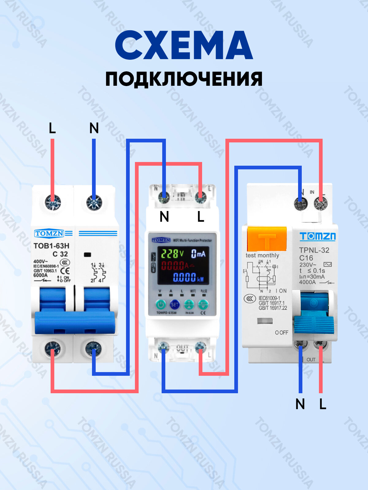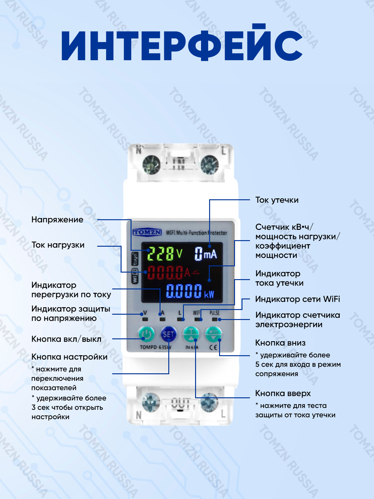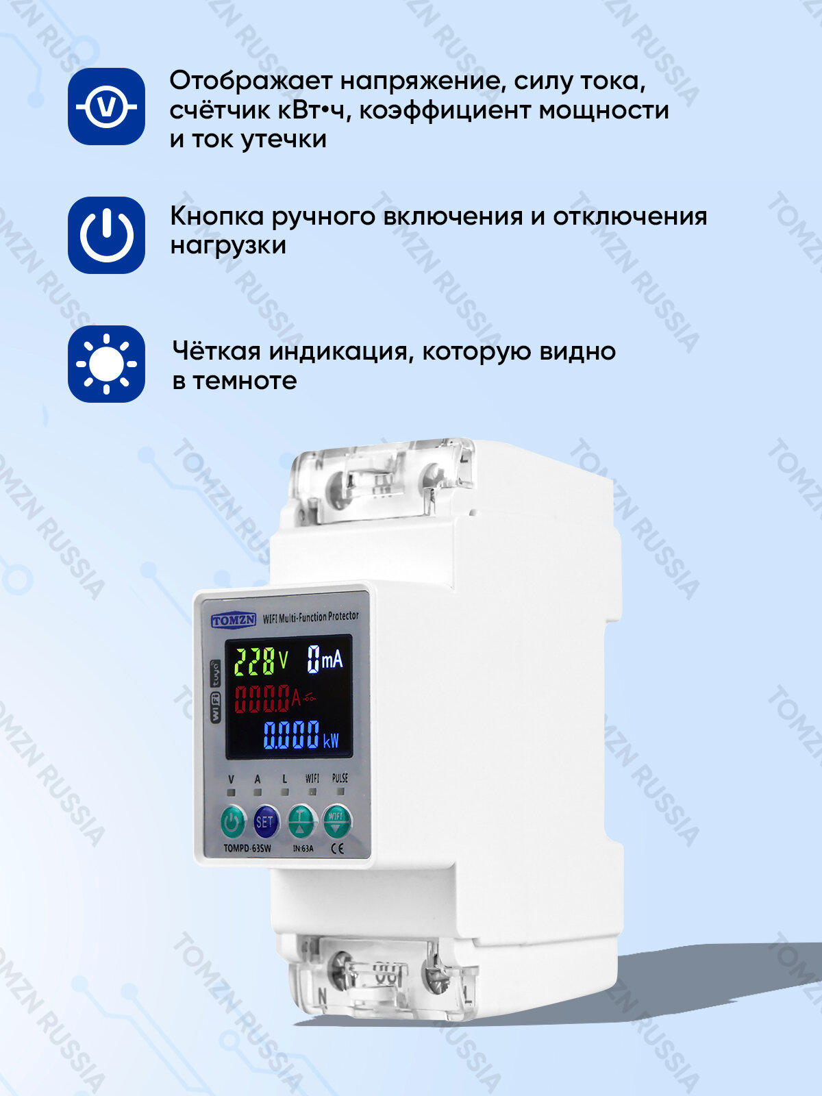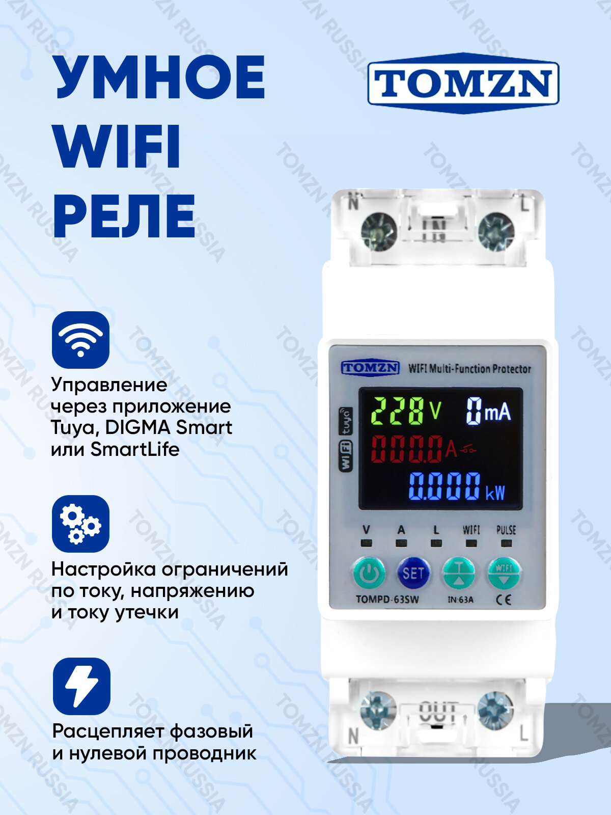 WiFi реле TOMZN TOMPD-63WIFI – это компонент для умного дома предназначенный для бытового использования в однофазной сети переменного тока 230 В 50/60 Гц дома или в малом офисе для дистанционного управления питанием через приложение Tuya Smart, Smart Life или DIGMA SmartLife.