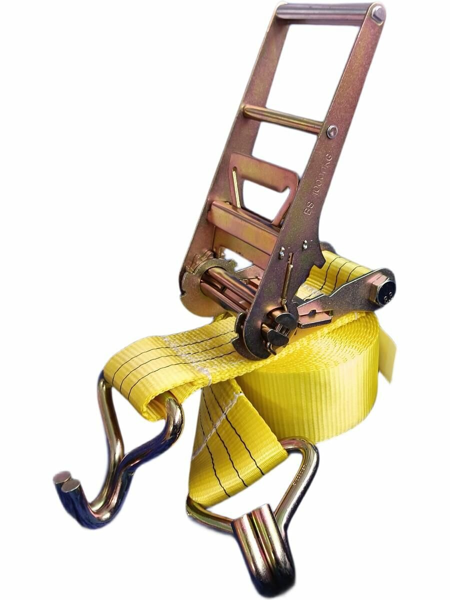 Текстильные стяжные ремни являются наиболее распространенным и безопасным креплением груза. Натяжное устройство обеспечивает надежную фиксацию груза стропой. Данное изделие сшито из усиленной стропы 7 класса прочности, разрывная нагрузка ленты 13,5 тонн.