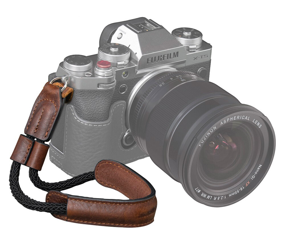 Универсальный кожаный ремешок на запястье для вашей камеры. Подходит для любого крепления, а также предусмотрена возможность затянуть его вокруг руки для большей надежности