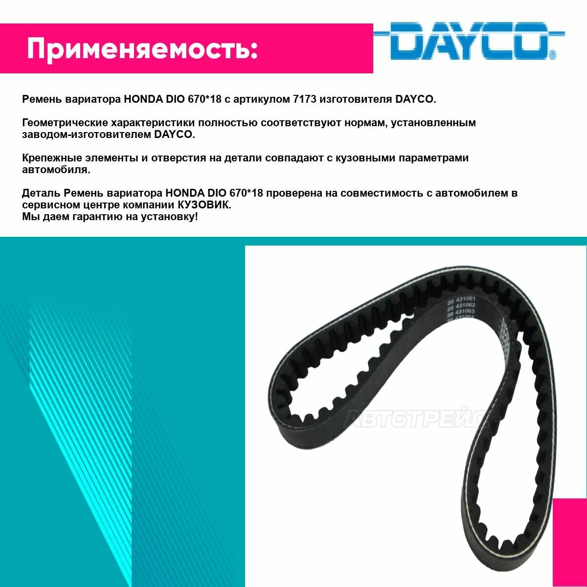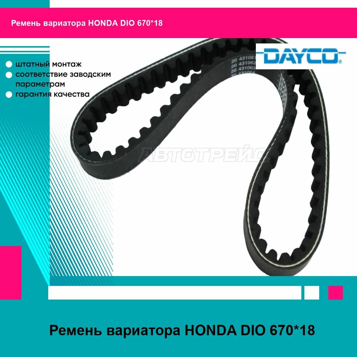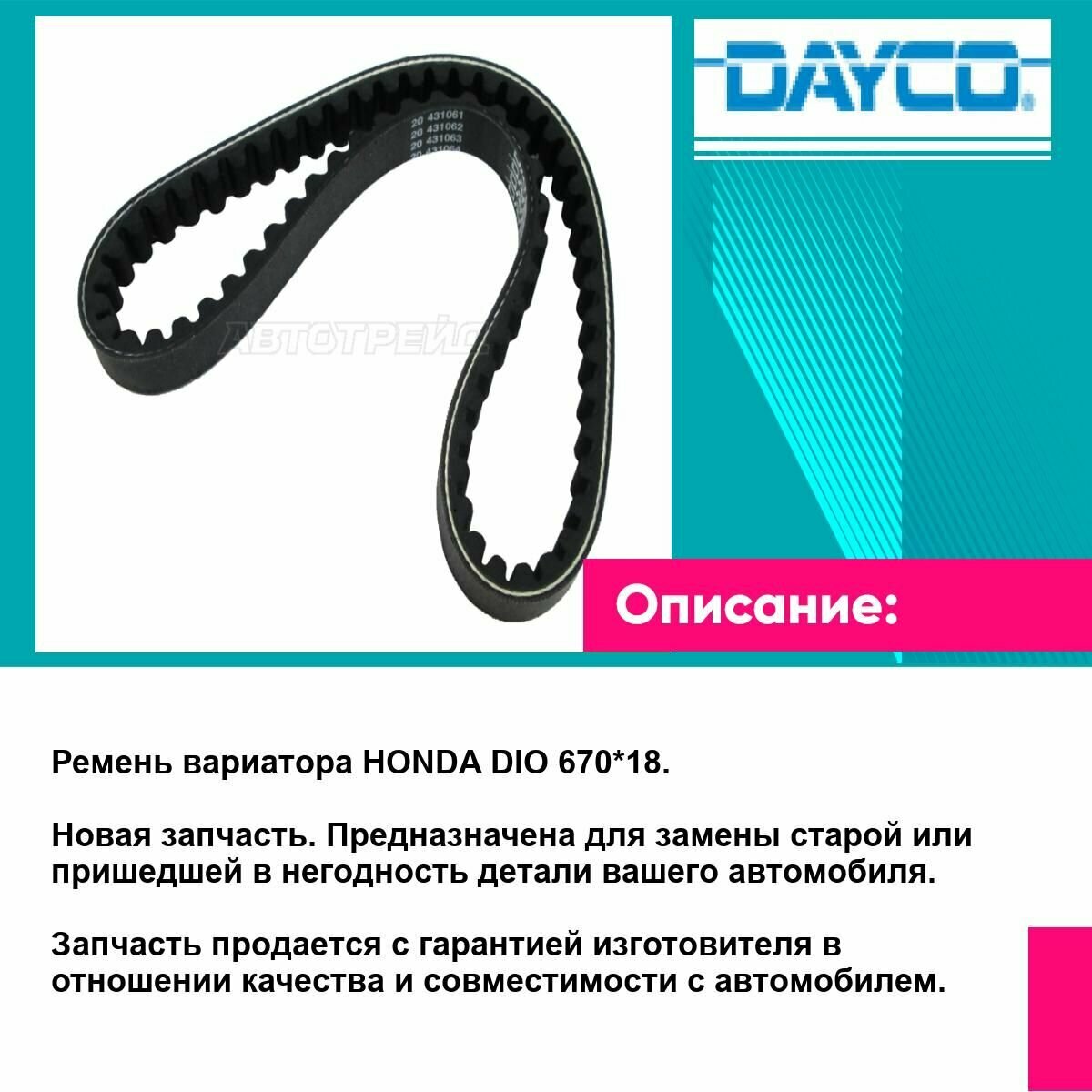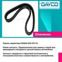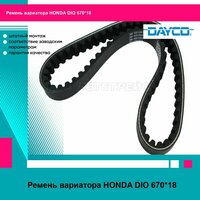Ремень вариатора HONDA DIO 670*18. Новая запчасть. Предназначена для замены старой или пришедшей в негодность детали вашего автомобиля. Изготовителем является торговая марка DAYCO. Запчасть продается с гарантией изготовителя в отношении качества и совместимости с автомобилем.