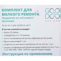 **Ремкомплект для изделий из литого мрамора** — эффективное средство для скрытия незначительных повреждений поверхности. Для восстановления используются те же вещества, что при производстве, поэтому структура материала не изменится. Проблемный участок следует зачистить, покрыть эмалью и отполировать в соответствии с инструкцией. ### Основные характеристики