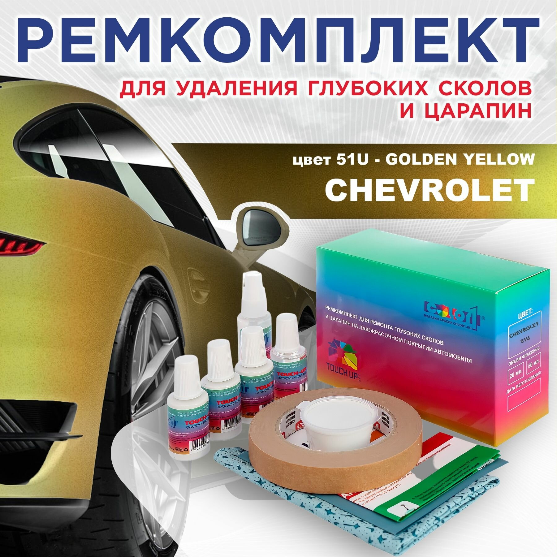 Купить Ремкомплект для ремонта глубоких сколов и царапин COLOR1 для CHEVROLET — GOLDEN YELLOW, цвет 51U с доставкой по всей России. Ремкомплект для ремонта глубоких сколов и царапин COLOR1 для CHEVROLET — GOLDEN YELLOW, цвет 51U: сравнение цен, характеристики, фото, актуальное наличие и цены.