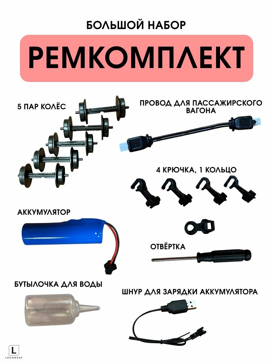 В набор входят 5 пар колёс, провод для пассажирского вагона, аккумулятор, 4 крючка, 1 кольцо, отвёртка, бутылочка для воды, шнур для зарядки аккумулятора.