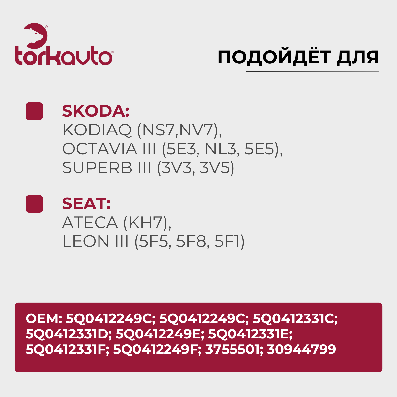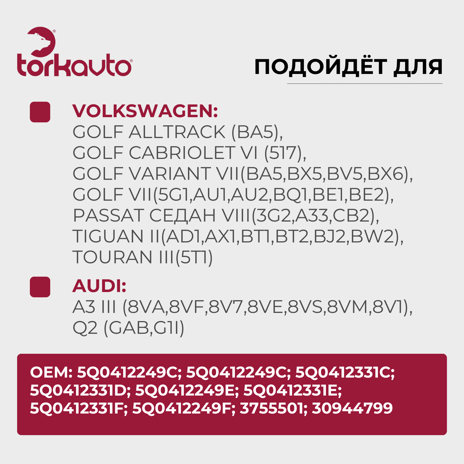 Альтернативные артикулы товара: 5Q0412249C; 5Q0412331C; 5Q0412331D; 5Q0412249E; 5Q0412331E; 5Q0412331F; 5Q0412249F; 3755501; 30944799