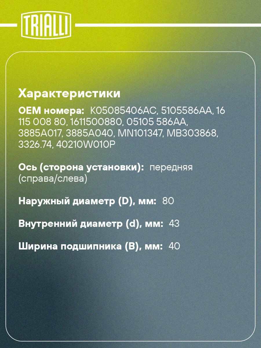 OEM номера: K05085406AC, 5105586AA, 1611500880, 05105 586AA, 3885A017, 3885A040, MN101347, MB303868, 3326.74, 40210W010P