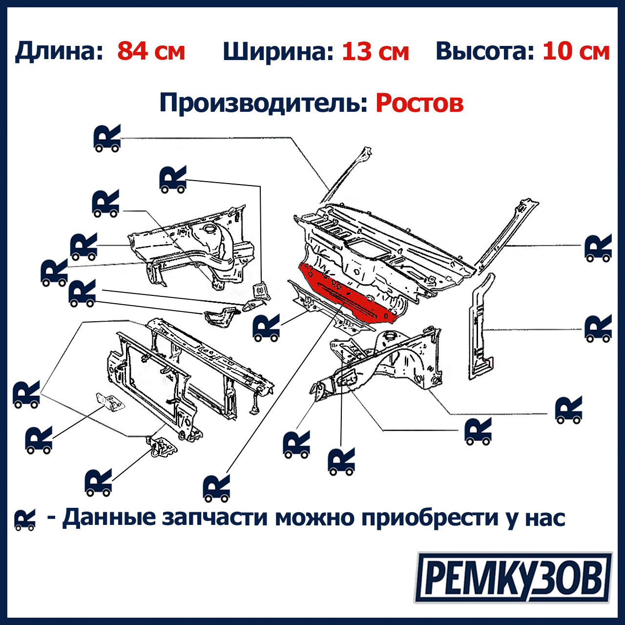 Нижняя ремонтная часть моторного щита ВАЗ 2108- используется при локальном ремонте кузова, когда возможно обойтись заменой нижней части детали, а не менять моторный щит целиком. Возможно применение на кузовах автомобилей ВАЗ 2108, ВАЗ 2109, ВАЗ 21099 и на более поздних модификациях ВАЗ 2113, ВАЗ 2114, ВАЗ 2115. Купить ремчасть моторного щита возможно только в неоригинальном исполнении.