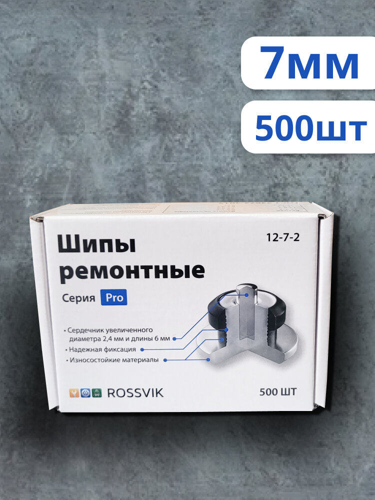 Ремонтные шипы ROSSVIK серия PRO, 12-7-2, 7 мм, 500 шт (для зимней резины): сравнение цен, характеристики, фото, актуальное наличие и цены.