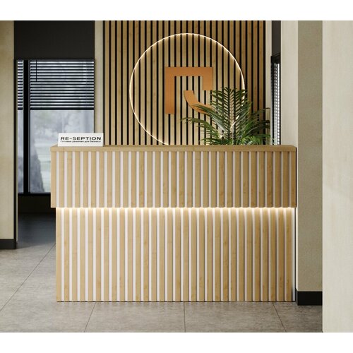 Дизайн и материалы: Ресепшн выполнен в современном стиле, сочетающем в себе белый цвет и текстуру клена. Материалы высокого качества обеспечивают долговечность и надежность конструкции.