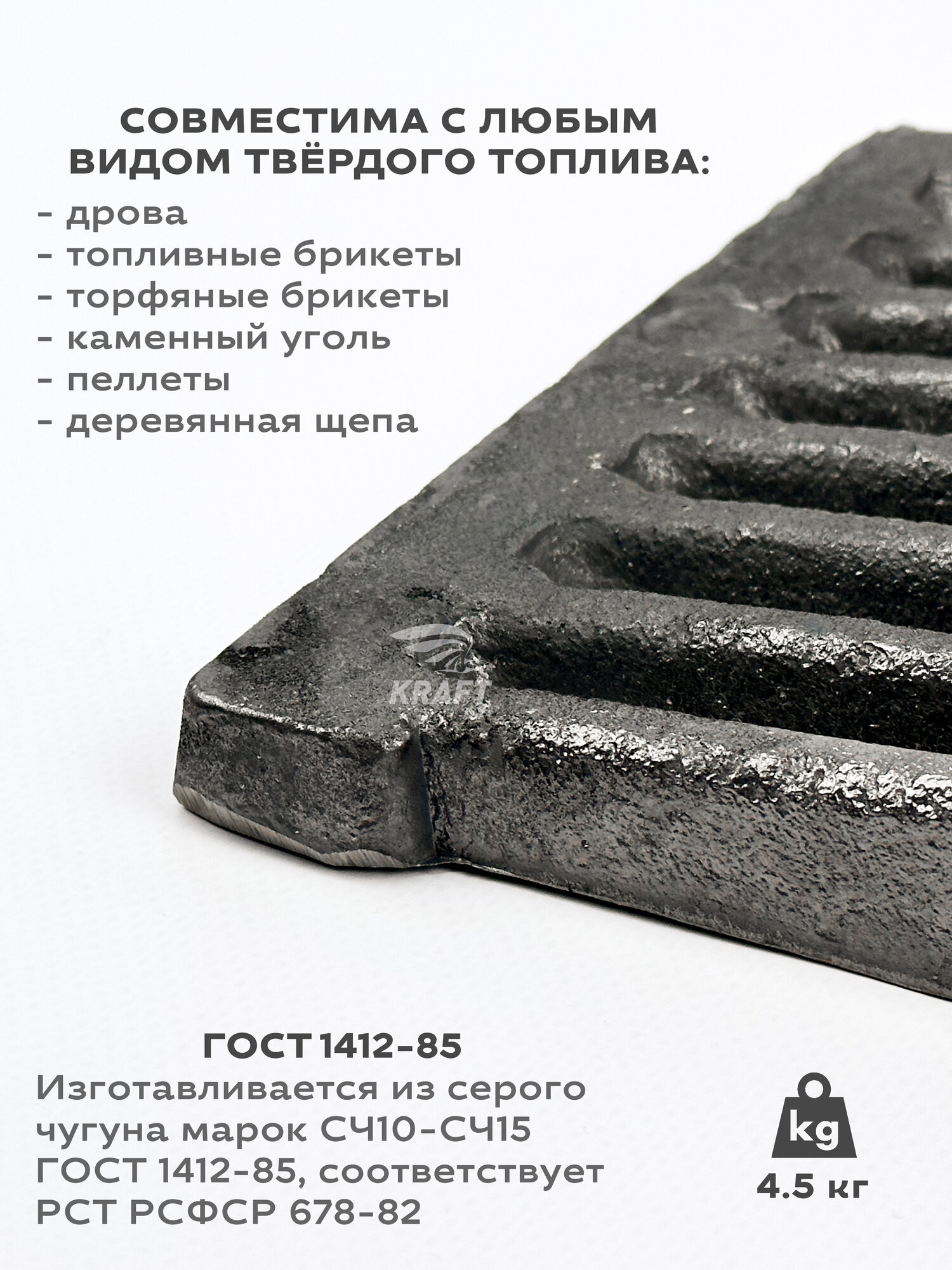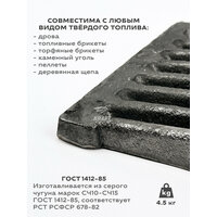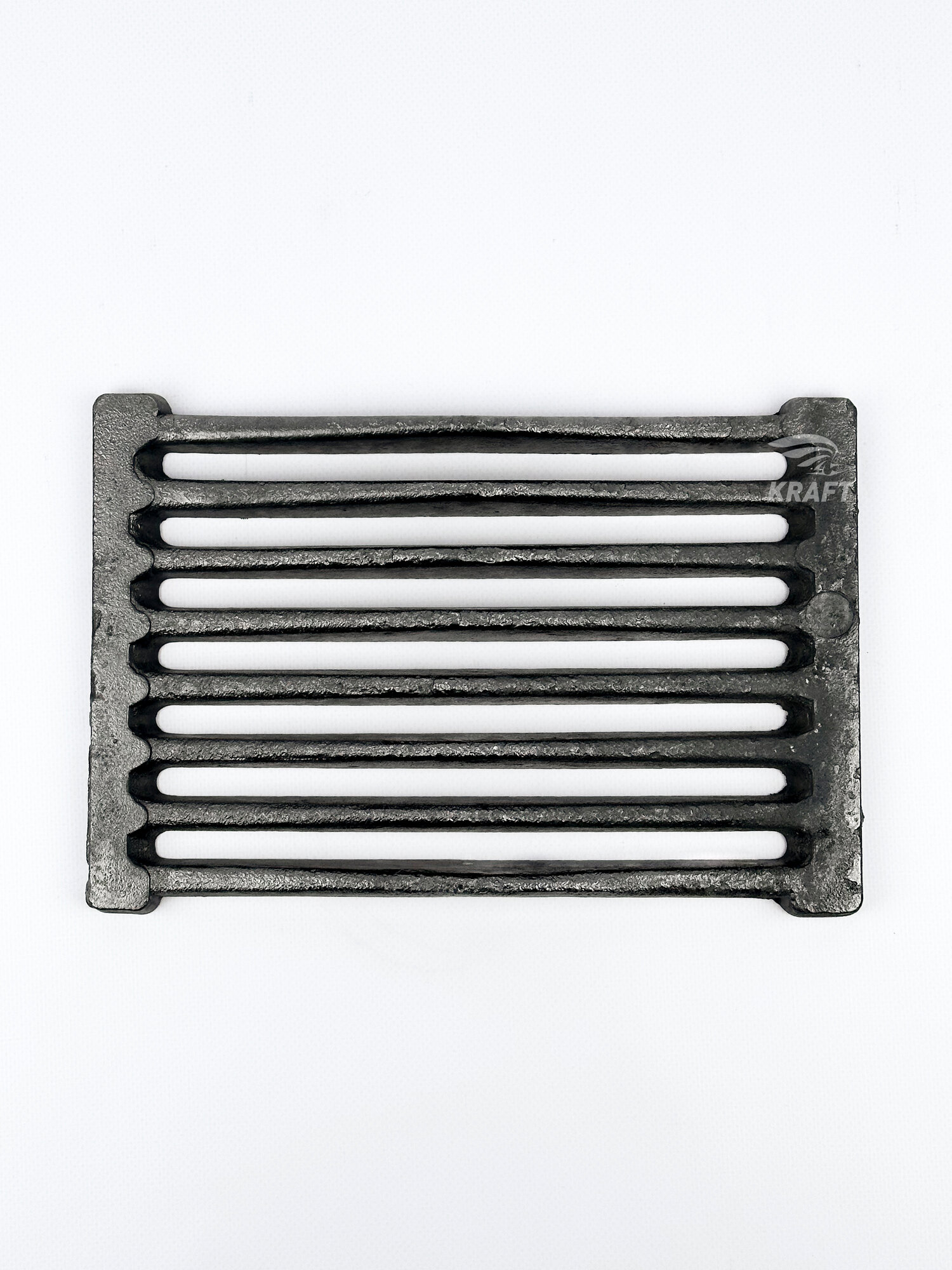 Колосник - это элемент гарнитуры топки, необходимая составляющая любой печи. Решетка для печи выполнена из жаропрочного литейного чугуна и предназначена для поддержания слоя твердого горящего топлива в топке и подвода воздуха в слой топлива через отверстия - прозоры. Колосник также выполняет функцию отвода золы из топочной камеры в зольник. Материал устойчив к повреждениям, деформации, не окисляется при взаимодействии с воздухом.
