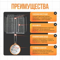 Сделано в России, г. Павлово — там, где мастерство с металлом доведено до совершенства. Решетка-гриль из пищевой нержавеющей стали AISI 304 создана для комфортного приготовления мяса, рыбы, овощей и других блюд. Без покрытия — только чистый вкус еды, без вредных добавок. Удобный фиксатор надежно держит крышку, а деревянная ручка из березы остается холодной. Усиленная конструкция решетки создает жесткий каркас, защищает от деформации. Толщина прутка каркаса 5мм, основной сетки 3мм.