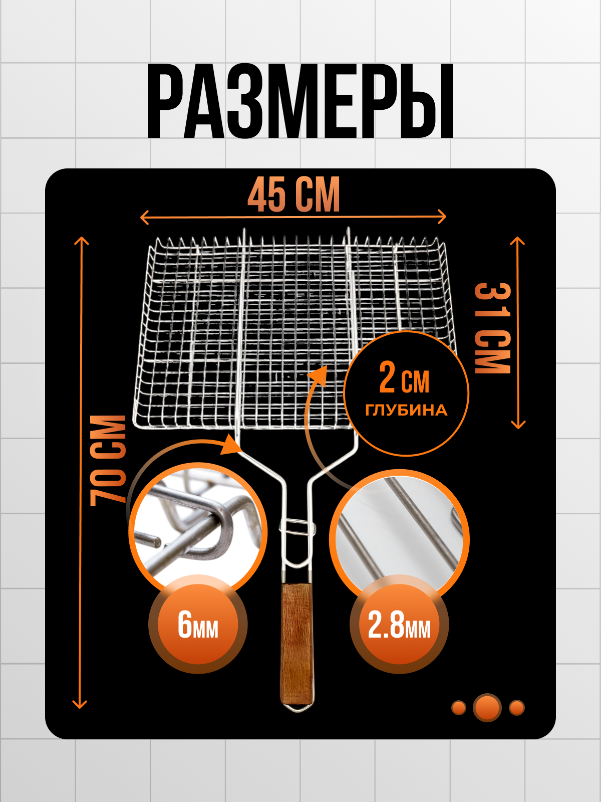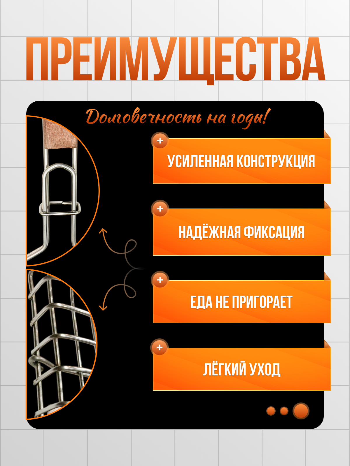 Сделано в России, г. Павлово — там, где мастерство с металлом доведено до совершенства. Решетка-гриль из пищевой нержавеющей стали AISI 304 создана для комфортного приготовления мяса, рыбы, овощей и других блюд. Без покрытия — только чистый вкус еды, без вредных добавок. Удобный фиксатор надежно держит крышку, а деревянная ручка из березы остается холодной. Усиленная конструкция решетки создает жесткий каркас, защищает от деформации. Толщина прутка каркаса6 мм , основной сетки 3мм.