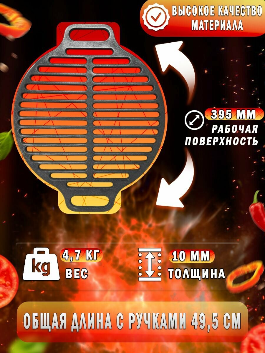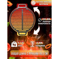 Решетка-гриль выполнена из экологически чистого и безопасного металла - чугуна и предназначена для приготовления блюд барбекю. Рабочая поверхность - d=400 мм. Габаритные размеры: 495х400х10 мм. Масса - 4,7 кг.