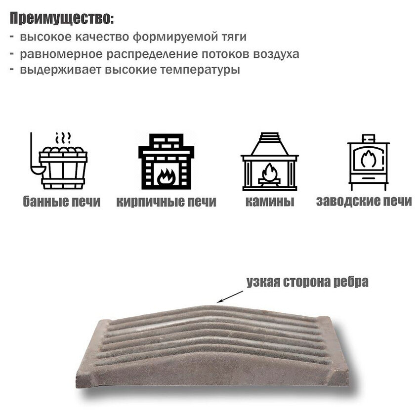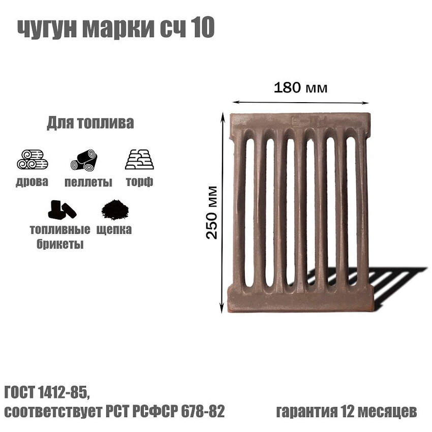 Характеристики: ГОСТ 1412-85; классификация: РД; типоразмер: 3; используемое топливо: дрова, брикеты из торфа; состояние: новое; металл: чугун марки СЧ 10; сопротивление при растяжении: 100 МПа; длина: 250 мм; ширина: 180 мм; вес: 3,1 кг; модель конструкции: монолитная; соответствует РСТ РСФСР 678-82; гарантийный срок: 12 месяцев; страна производитель: Россия.