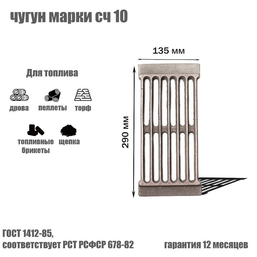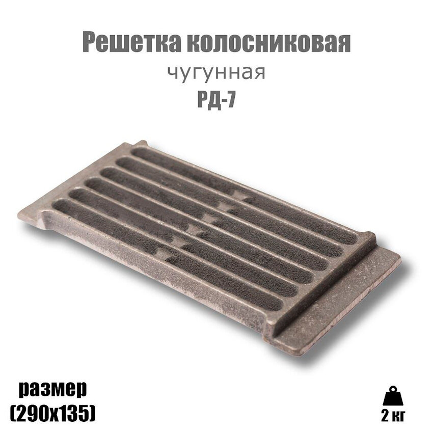 Характеристики: ГОСТ 1412-85; классификация: РД; типоразмер: 7; используемое топливо: дрова; состояние: новое; металл: чугун марки СЧ 10; сопротивление при растяжении: 10 кг/мм2; длина: 290 мм; ширина: 135 мм; вес: 2 кг; модель конструкции: монолитная; соответствует РСТ РСФСР 678-82; гарантийный срок: 12 месяцев; страна производитель: Россия.