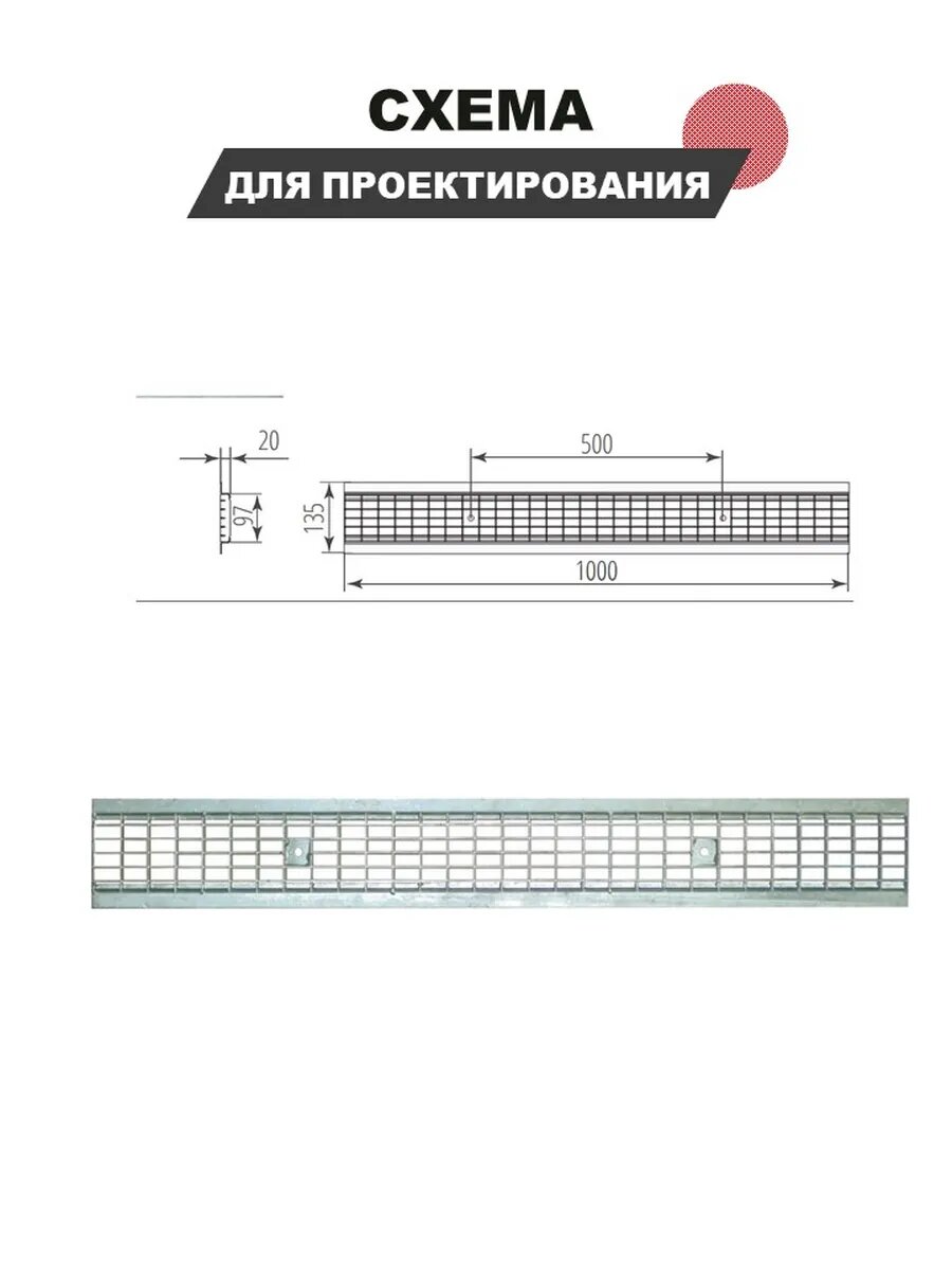 Решетка стальная для ливневой канализации Класс нагрузки В125-можно применять для дорог с малой интенсивностью. Допустима укладка стальной ячеистой решетки для частных домовладений, на стоянках, парковках для легковых машин, гаражах, если нагрузка на них не превышает 125 кН (12,5 т). Материал водоприемной решетки – сталь покрытая горячим цинком. Ливневая решетка оборудована посадочным местом под винт для крепления фиксаторами. Решетка подходит для ливневых лотков серии DN100. Решетка сварная ячеистая для водоотводного лотка ливневой канализации защищает от посторонних предметов, имеет повышенную степень водопоглощения, применяется для защиты системы поверхностного водоотвода от мусора и безопасного движения пешеходов и транспорта. Стальная решетка оцинкованная для ливневки устанавливается в местах с динамической нагрузкой не превышающей допустимых значений. Дождевая или ливневая канализация решает важную задачу – она нужна, чтобы влага от осадков не подтопила ваш дом, строение, и чтобы на территории участка было всегда сухо и уютно. Основной задачей ливневки для сточных вод является устранение влаги скапливающей после дождя и создающей дискомфорт жителям, разрушая конструкции и вызывая гниение растений.