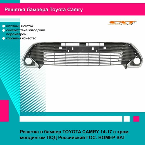Решетка в бампер Toyota Camry Europe/Russia (XV50). Новая запчасть. Предназначена для замены старой или пришедшей в негодность детали вашего автомобиля. Изготовителем является торговая марка SAT. Запчасть продается с гарантией изготовителя в отношении качества и совместимости с автомобилем.