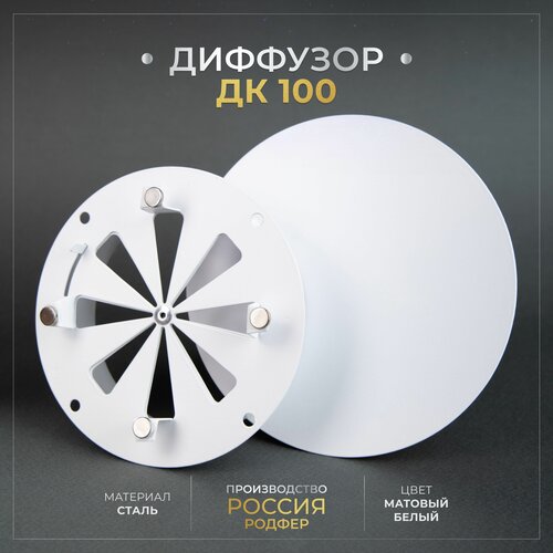 Диффузор с регулировкой от российского производителя "Родфер" выполнена из стали и состоит из двух частей. Рамка с круглым патрубком крепится к стене при помощи саморезов или клея или вставляется в трубу диаметром 100 мм, а декоративная часть фиксируется к рамке при помощи магнитов.