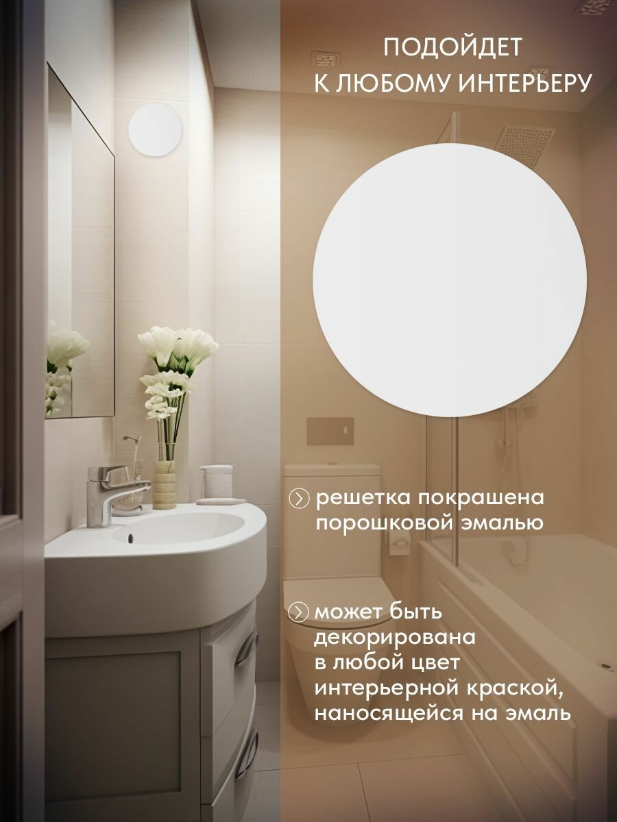 Подходит для настенного и потолочного монтажа для декоративного оформления выходов приточно-вытяжных систем вентиляции, вытяжек, для скрытия любых ниш, вентиляции шкафов и гардеробных. Устанавливается в ванной комнате, туалете кухне и других жилых или общественных помещениях.