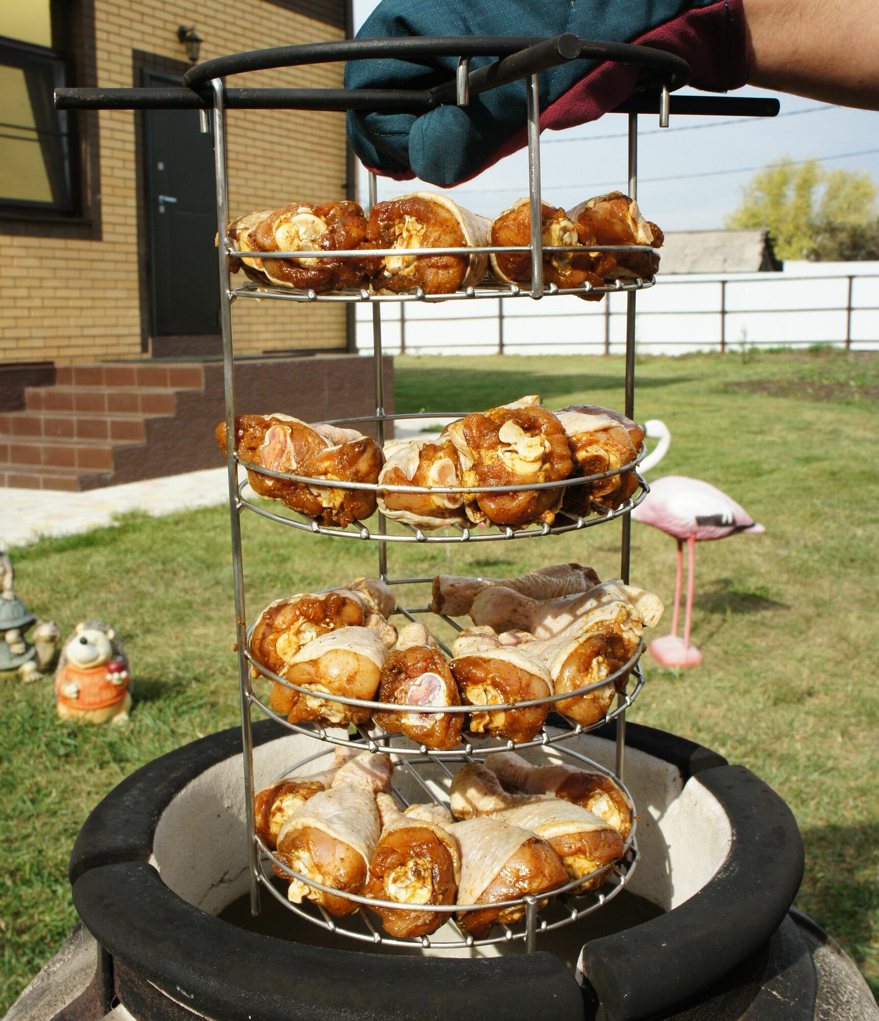 Этажерка для тандыра позволяет приготовить множество мясных, грибных, рыбных или овощных блюд, причём нередко одновременно: на нижнем ярусе может разместиться один вид продуктов, на среднем — иной, и на верхнем расположится третий. Этажерка нашего производства очень прочна, производится из пищевой нержавеющей стали, включает в себя и дополнительное кольцо, которое не позволяет продуктам «выскочить» за её пределы.