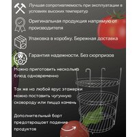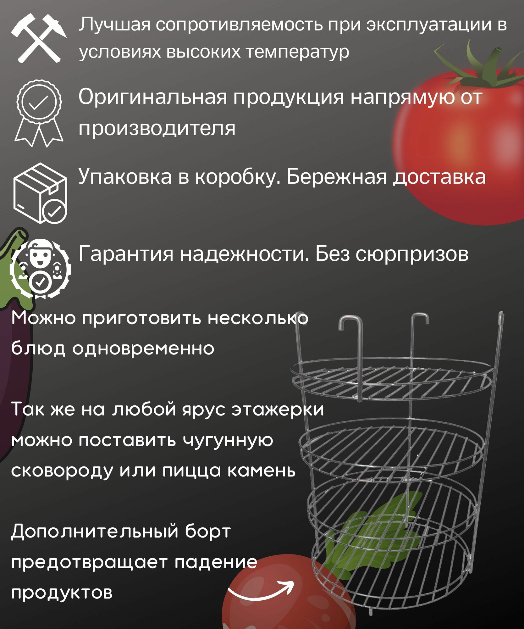Главные параметры такого аксессуара — высота, диаметр и этажность. На нашу этажерку можно установить чугунную сковороду с продуктами или пицца камень.