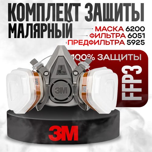 Полумаска 6200 3M - 1шт, основные фильтры 3М 6051 - 2шт, предфильтры 3М 5925 - 2шт, пластиковые держатели 3М 501 - 2шт