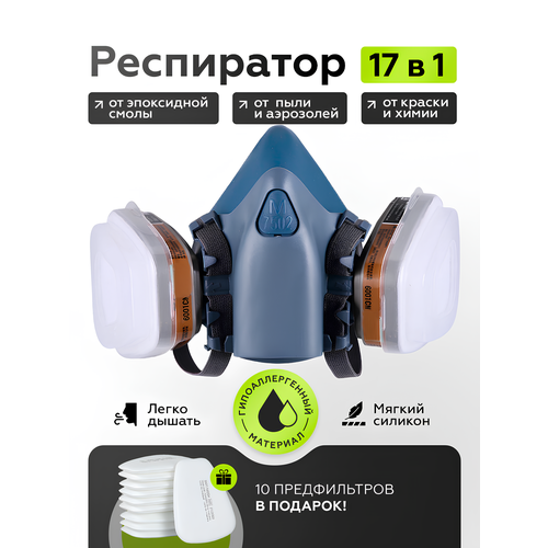 Наш респиратор станет надежным защитником Вашего здоровья и обеспечит безопасность от вредных веществ. В набор входит: маска 7502, фильтр 6001 (класс защиты А1) - 2 шт, сменный фильтр Р1 (KN 95) - 2 шт, крышка фильтра - 2 шт.
