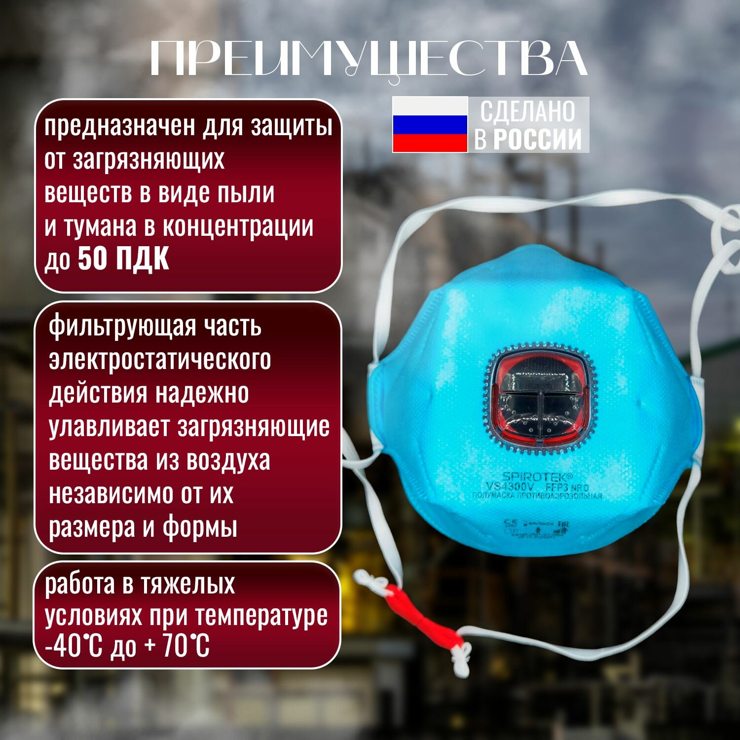 Противоаэрозольная одноразовая фильтрующая полумаска Spirotek VS4300V предназначена для защиты от попадания через рот и нос в горло и легкие загрязняющих веществ в виде пыли, дыма и тумана в концентрации до 50 ПДК в соответствии с установленными нормами.