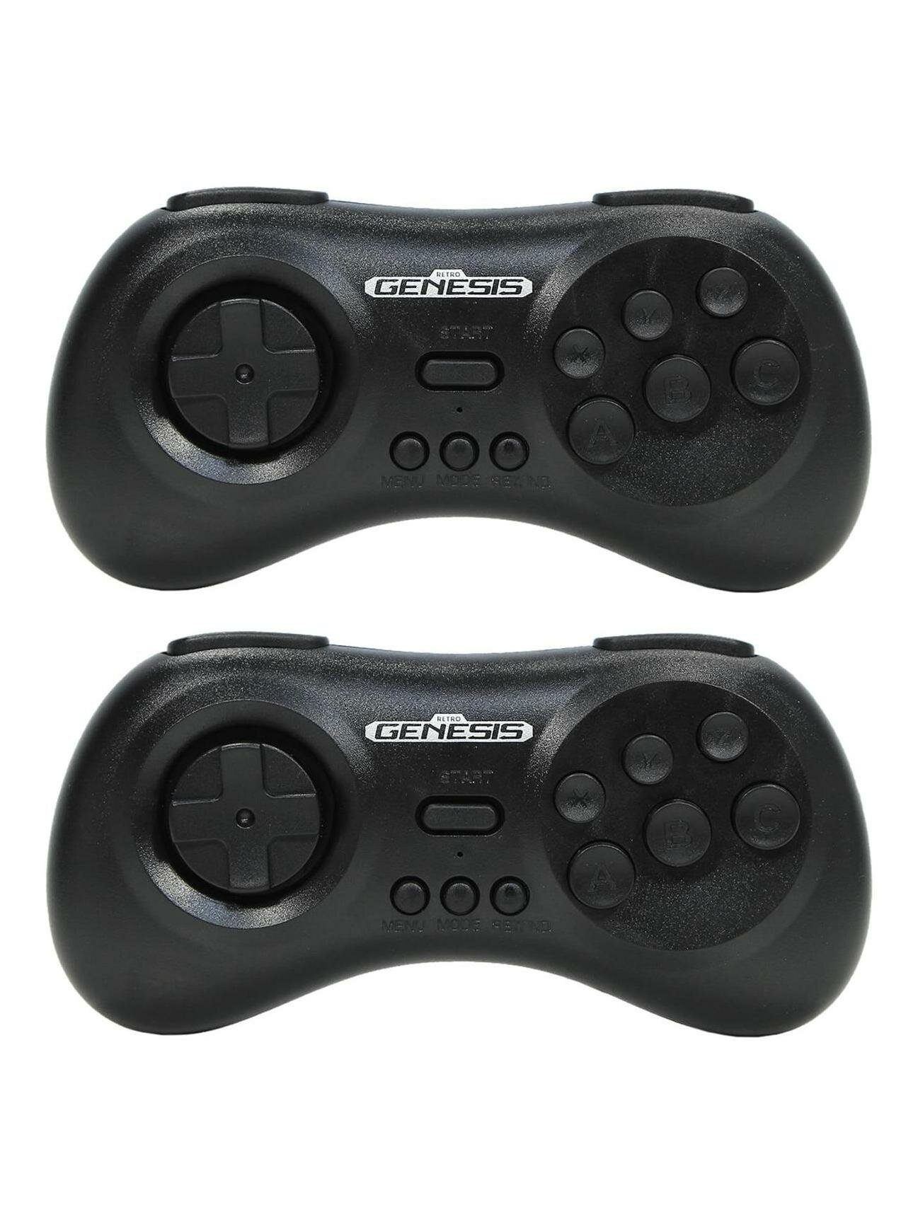 Два беспроводных джойстика в форме "Sega" с кнопками выхода в меню и кнопкой Rewind,