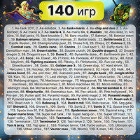 Список полноценных встроенных игр (140игр*): 1. Aa-tank 2011, 2. Aa-kolobok, 3. Aa-tank+mario, 4. Aa-chip and dale 2, 5. Aa-bomber, 6. Aa-mario 3, 7. Aa-mario 4, 8. Aa-mario 64, 9. Aladdin , 10. Alex kidd, 11. Art alive, 14. Ball jacks, 15. Bare knuckle 3 , 16. Bare rnuckle , 17. Batman , 18. Batman robm , 19. Batman returns , 20. Batman revenge, 21. Battle toads , 22. Battle toads 2, 23. Castle illusion , 24. Championship pool, 25. Chase h.Q, 26. Chess, 27. Colmus 3, 28. Combat cars , 29. Comix zone , 30. Contra , 31. Cool spot 1 , 32. Daffy duck, 33. Demolition man , 34. Desert strike , 35. Double clutch, 36. Double dragon 2, 37. Double dragon 3, 38. Dragon's eye 3, 39. Dune 2 , 40. Dynamite duke , 41. Earthworm jim 1, 42. Ecco jr , 43. Ecco , 44. Eswat , 45. F1 hero, 46. Fantasia, 47. Fantastic dizzy , 48. Fatal labylinth, 49. Fighting masters, 50. Flikcky, 51. Flintstones , 52. Fun car rally , 53. Ghostbusters , 54. Gods , 55. Golden axe 3 , 56. Green dog , 57. Hard drivin, 58. Hercules 1, 59. Hockey , 60. Hockey 93 , 61. Home alone 2, 62. Hook , 63. Hulk , 64. James bond, 65. Joe and mac , 66. Juarussic park , 67. Jungle book , 68. Jungle strike , 69. Klax, 70. Last battle , 71. Last vikings, 72. Lion king 1 , 73. Lotus turbo , 74. Lotus 2, 75. Mahjong dragon , 76. Maximum carnage , 77. Megapanel, 78. Mermaid , 79. Micro machines , 80. Micro machines 2, 81. Micro machines 96, 82. Micro military, 83. Midnight resis, 84. Mortal kombat , 85. Mortal kombat 2 , 86. Mortal kombat 4, 87. Ms pacman, 88. Ninja turtle , 89. Osomatsu-kun , 90. Pac-attack , 91. Pink hollywood , 92. Pro-am , 93. Putter golf, 94. Pyramid magic, 95. Pyramid magic 2, 96. Pyramid magic 3, 97. Pyramid special, 98. Quack shot, 99. Rambo 3, 100. Road rash 1 , 101. Road rash 2 , 102. Road rush 3 , 103. Robocop 3 , 104. Rock'n roll, 105. Rolo rescue , 106. Seg gala, 107. Shinobi 3, 108. Shove it , 109. Sonic , 110. Sonic 2 , 111. Sonic 3, 112. Space inva 90 , 113. Space inva 91, 114. Spider-man , 115. Spiderman xmen , 116. Squirrel king , 117. Super mario bros, 118. Super bat tank , 119. Super hang-on , 120. Super off road , 121. Super volley , 122. Talespin , 123. Tazmania , 124. Tecmo worl 92 , 125. Tecmo worl 93, 126. Terminator , 127. Terminator 2, 128. Test drive 2, 129. Tetris , 130. Tiny toon , 131. Tom & jerry, 132. Top gear 2 , 133. Trampo terror, 134. Turbo outrun , 135. Ultimate qix, 136. Urban strike , 137. Vector man , 138. Worms, 139. X-men, 140. Zoom.